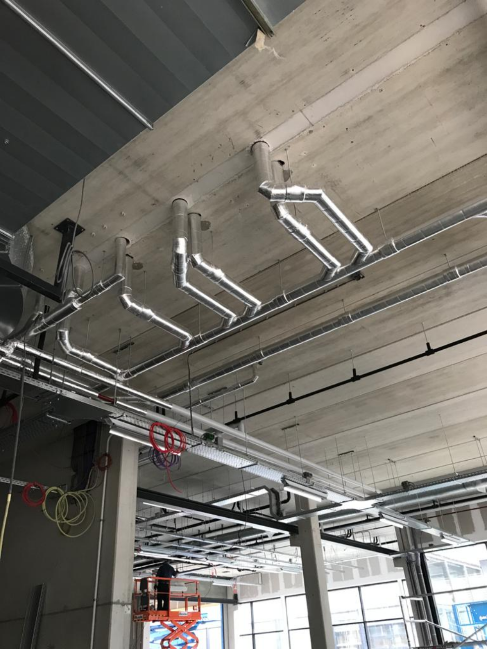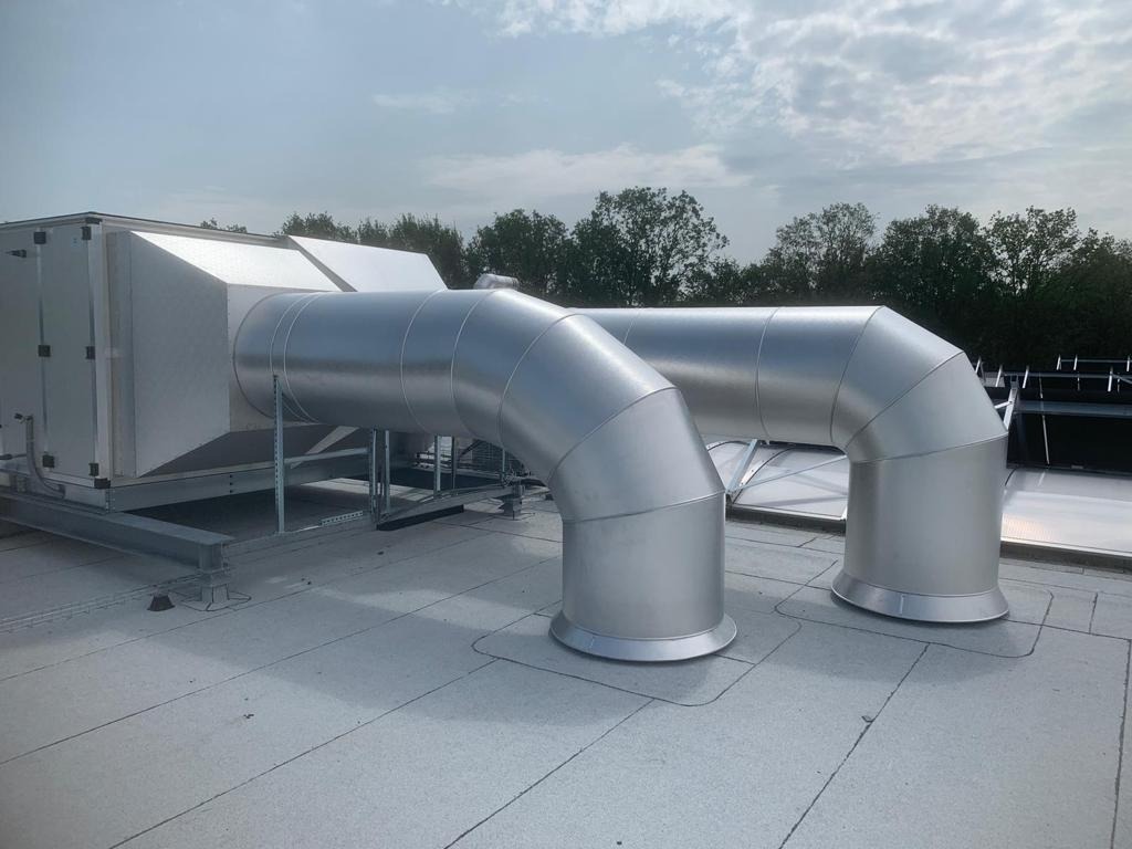 Buitengelegen luchtkanalen geïsoleerd met steenwol, afgewerkt met aluminium stuccoplaat